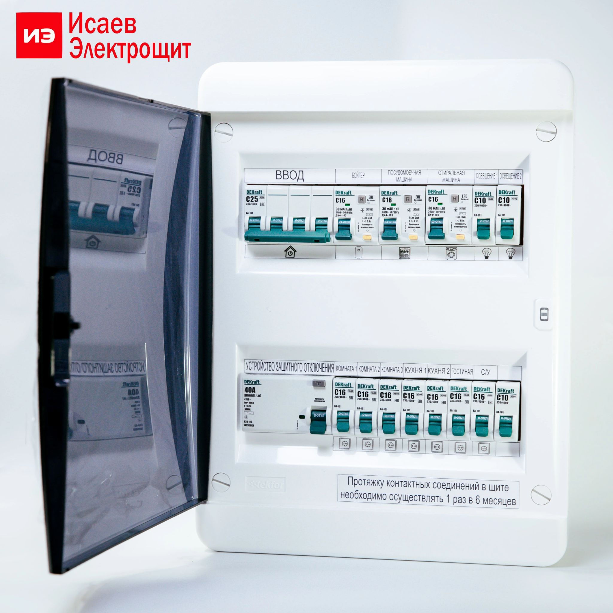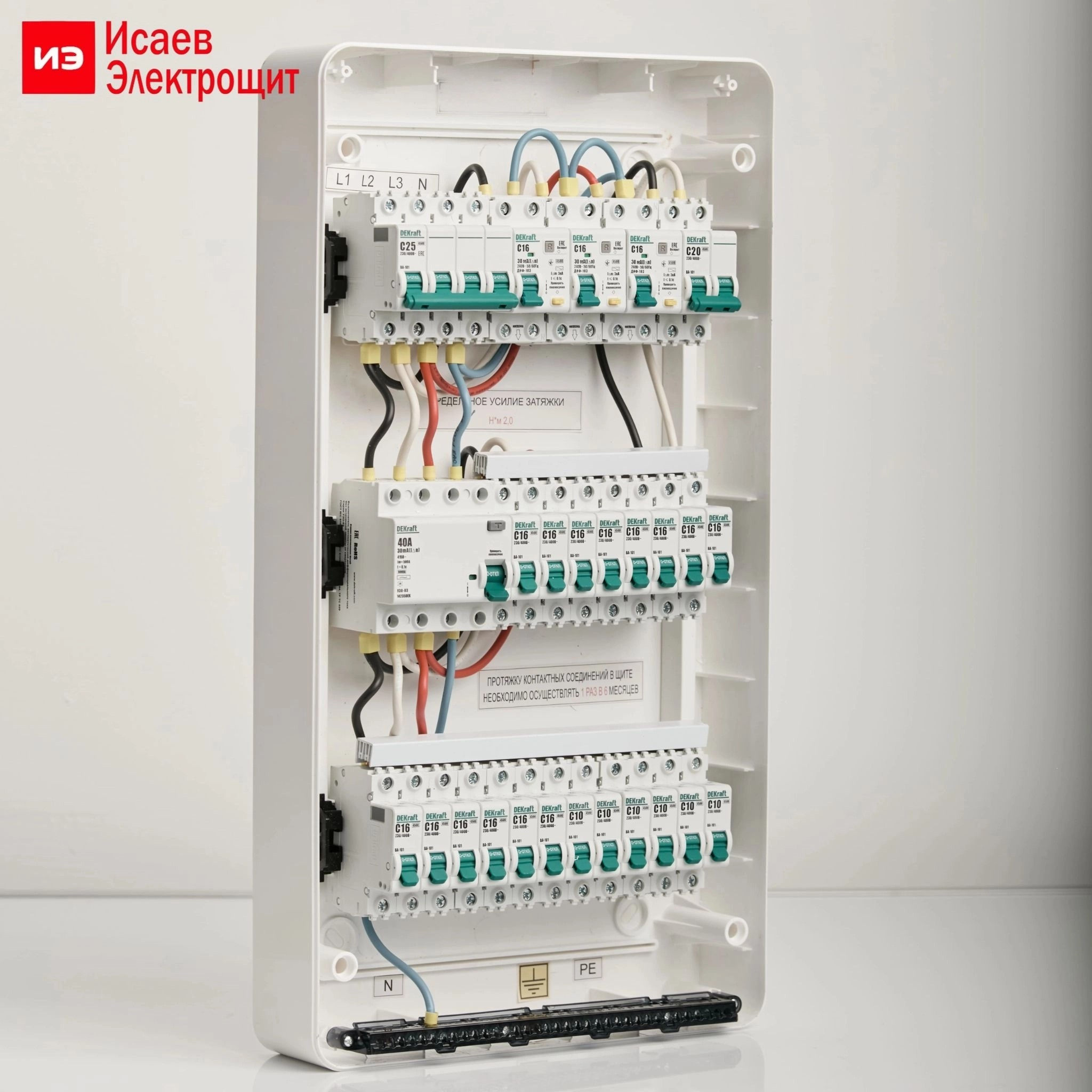 Состав: С25А 4Р - 1шт, ВДТ (УЗО) 3Ф+N 40А - 1шт, С16А - 7шт, С10А - 3шт, АВДТ(ДИФ) С16А 30мА - 3шт