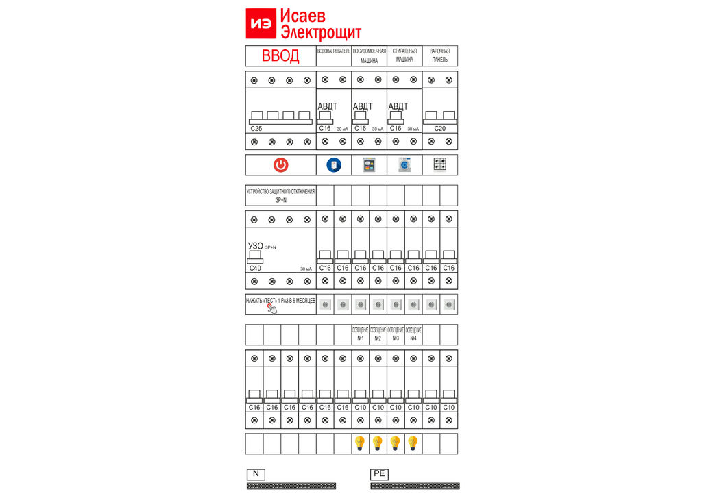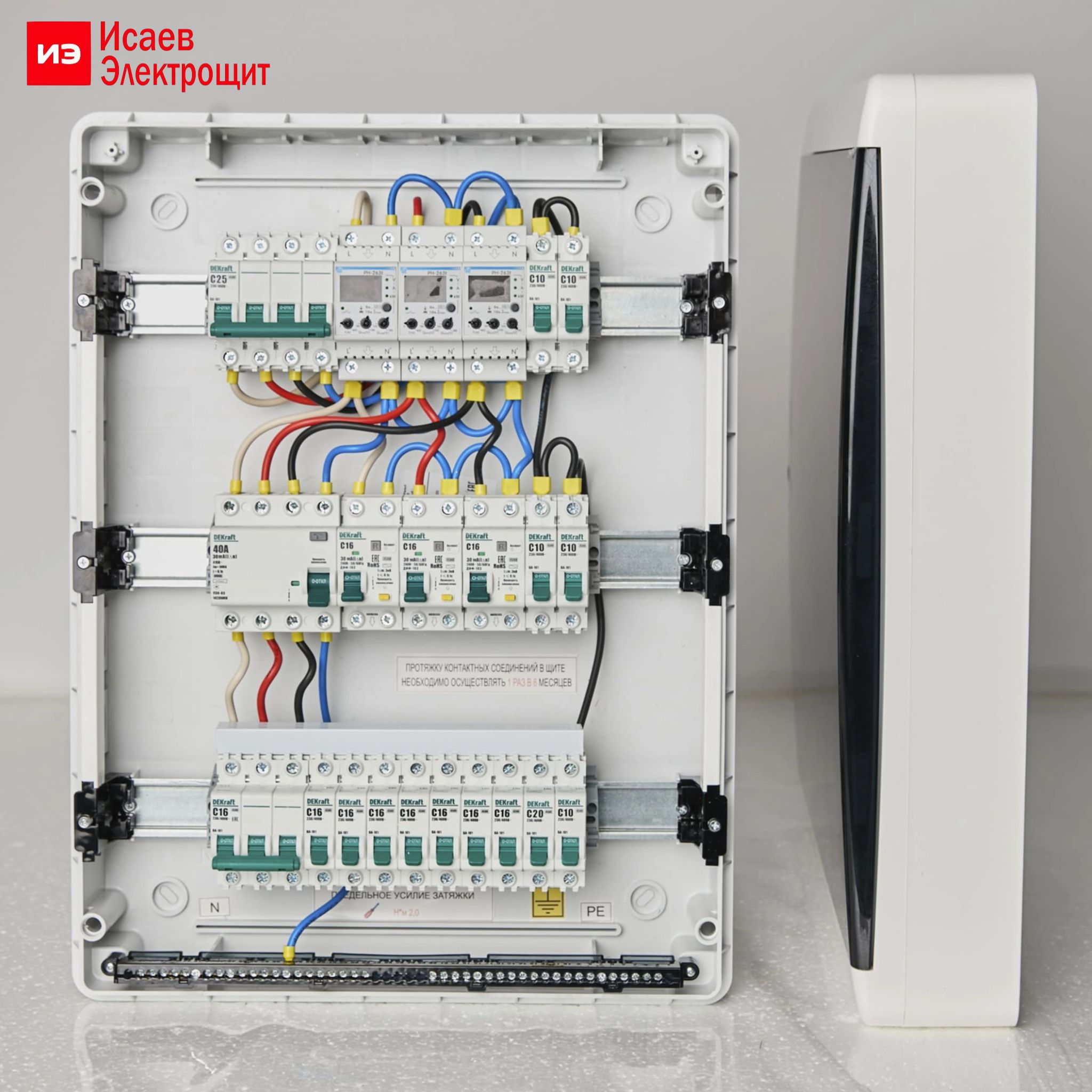 Состав: С25А 4Р - 1шт, ВДТ (УЗО) 3Ф+N 40А - 1шт, С20А 2Ф - 1шт, С16А - 14шт, С10А - 6шт, АВДТ(ДИФ) С16А 30мА - 3шт