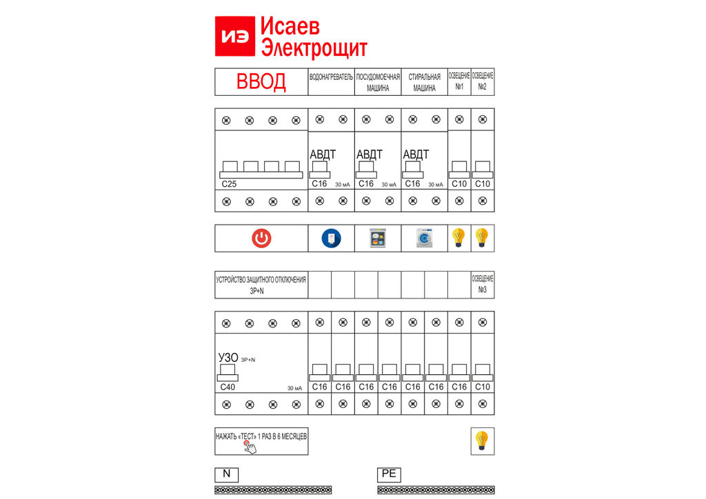 • 1 общее УЗО 30мА для защиты человека от поражения током