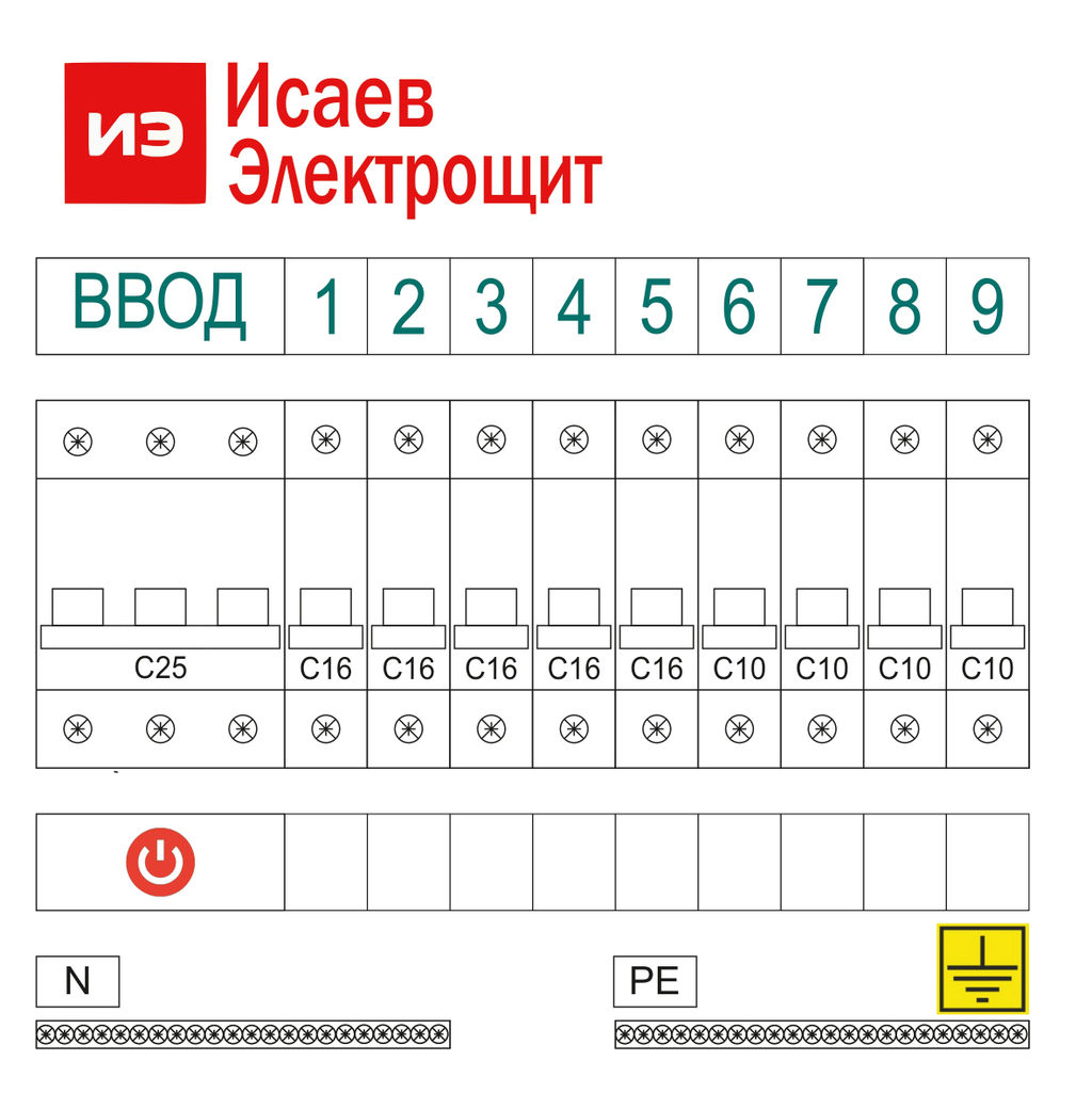 Вводной автоматический выключатель С25А 3Р, на вводную мощность от 5,5 кВт до 15 кВт в зависимости от однофазного или трёхфазного подключения.