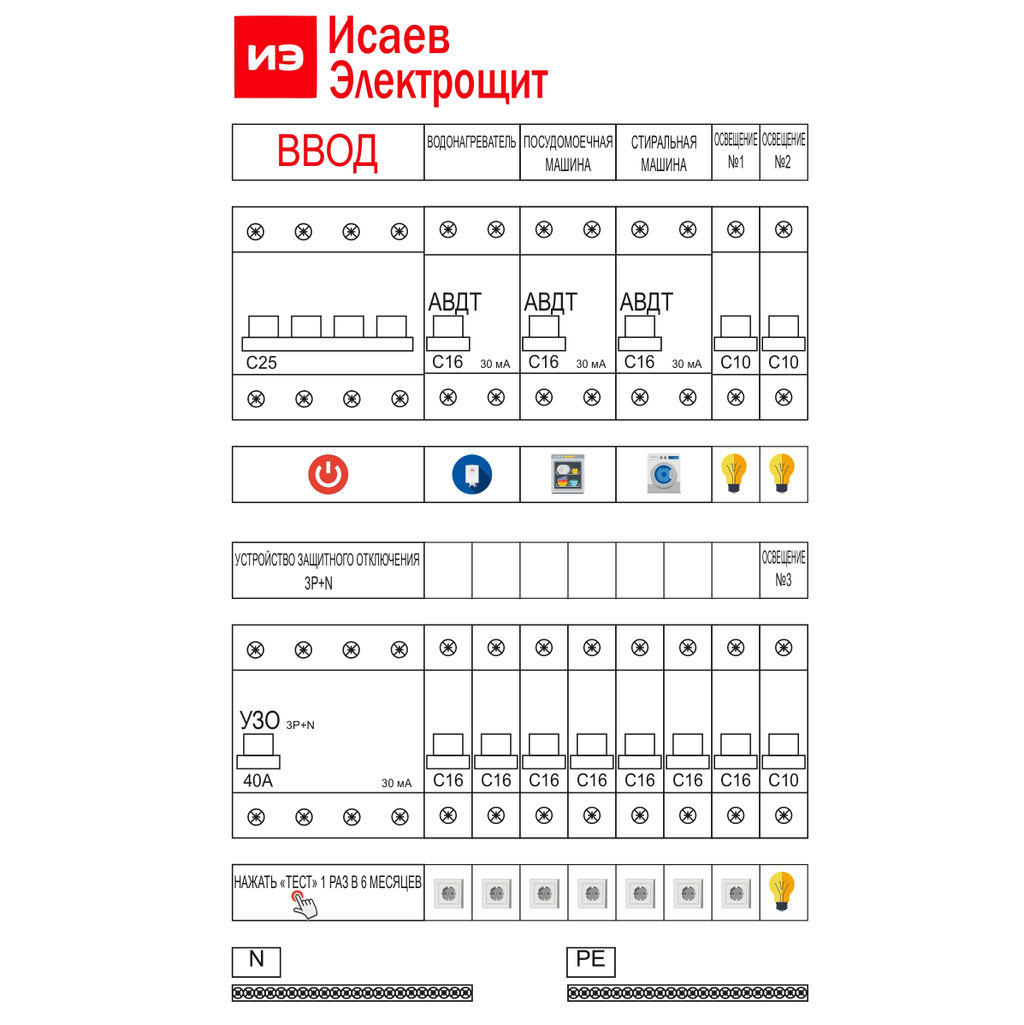 АВДТ дифференциальные автоматы 1Р+N C16А 30мА – 3 шт., на особо «ответственные потребители, такие как бойлер, стиральная машина, насос ХВС и прочее.
