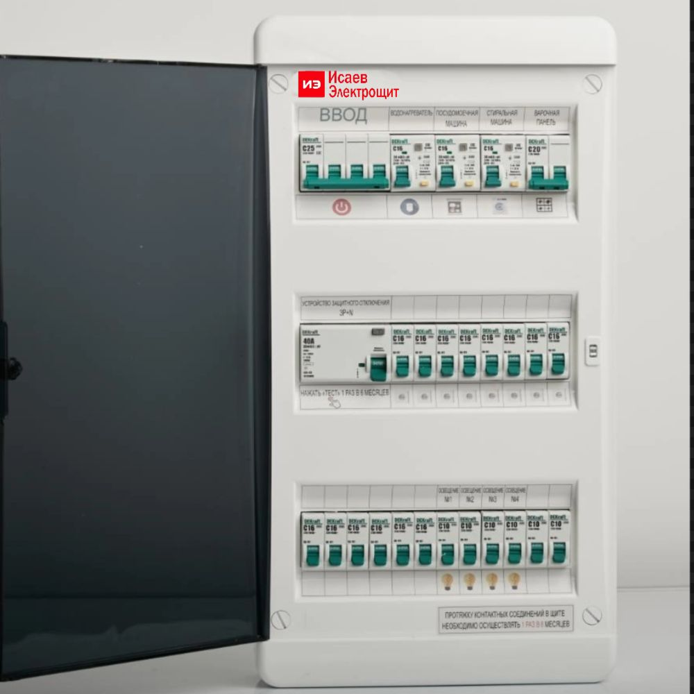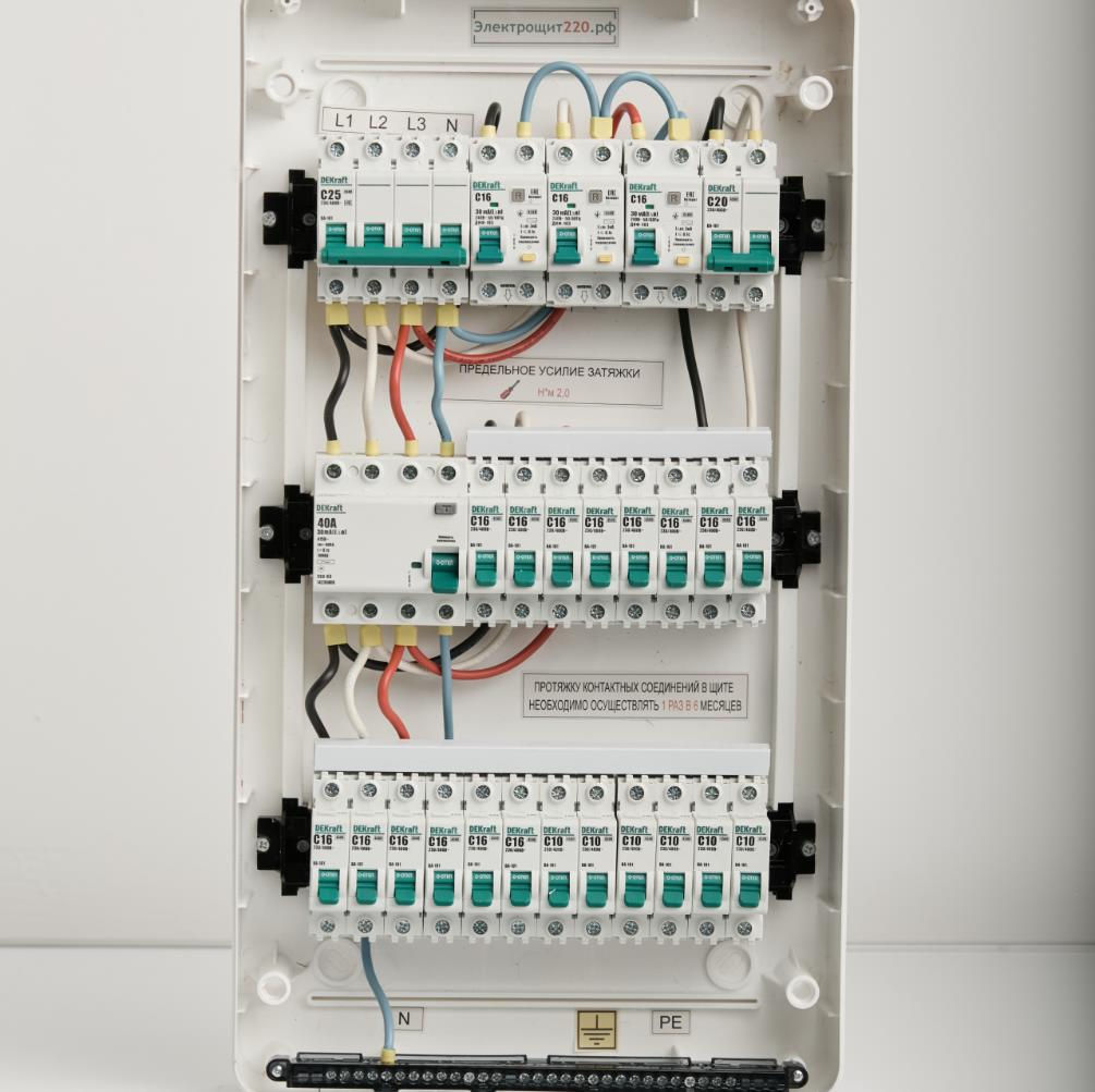 Вводной автоматический выключатель С25А 4Р, на вводную мощность 15 кВт, на 3 фазы.